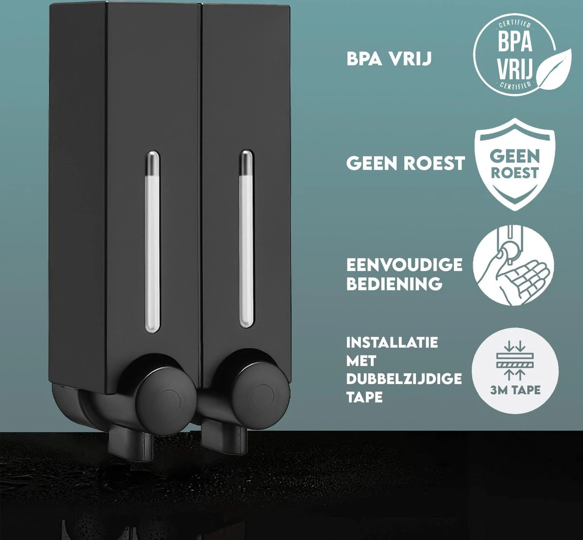 Aquathof, Zeepdispenser, Mat Zwart, 2 Kamer, 2 Reservoirs, 2x250ml – Hangend – Wandmontage