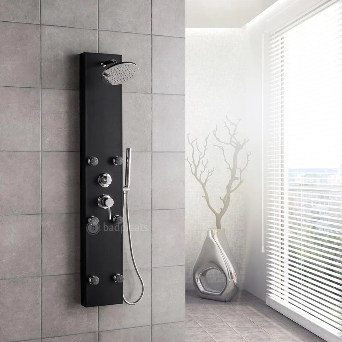 Douchepaneel Valencia is een zwart douchepaneel uitgevoerd met een mengkraan. Het douchepaneel heeft zes massage units, één handdouche en één hoofddouche. Verder heeft het douchepaneel één draaiknop waarmee de drie douchestanden worden geregeld. Dit betekent dat maximaal twee verschillende standen tegelijk gebruikt kunnen worden. De andere draaiknop op het douchepaneel wordt gebruikt voor het regelen van de temperatuur door middel van een mengkraan.