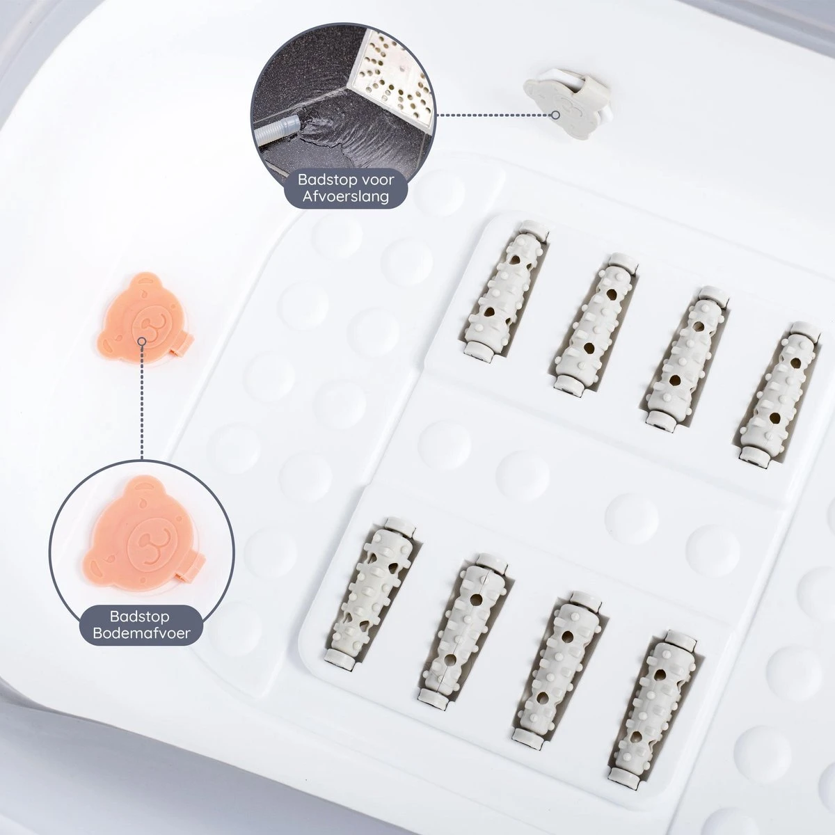 Door de bijgeleverde 3-delige deksel op het bad te plaatsen, geniet je tot wel een uur lang van warm water. Gebruik de middelste deksel als badplank voor je hapje, drankje en laptop of tablet om lekker van je favoriete serie te genieten. De ingebouwde voetmassagerollers stimuleren de bloedcirculatie van de voeten en geeft verlichting bij rusteloze benen. Heb je behoefte aan gezelschap in bad? Dan kan (het afritsbare gedeelte van) het badkussen over de rollers worden geplaatst.