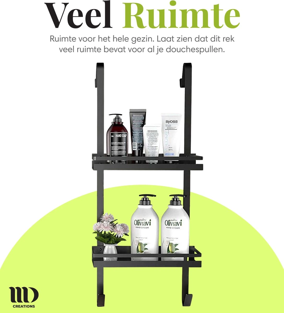 Vergeet geklooi met boormachines en pluggen: Dankzij het innovatieve design hang je het MD creations doucherek eenvoudig aan de douchewand. Stevige zuignappen houden het rek stevig op zijn plaats. Het tweelaags doorlatende ontwerp zorgt ervoor dat je altijd genoeg ruimte hebt zonder je zorgen te maken over kalkaanslag.