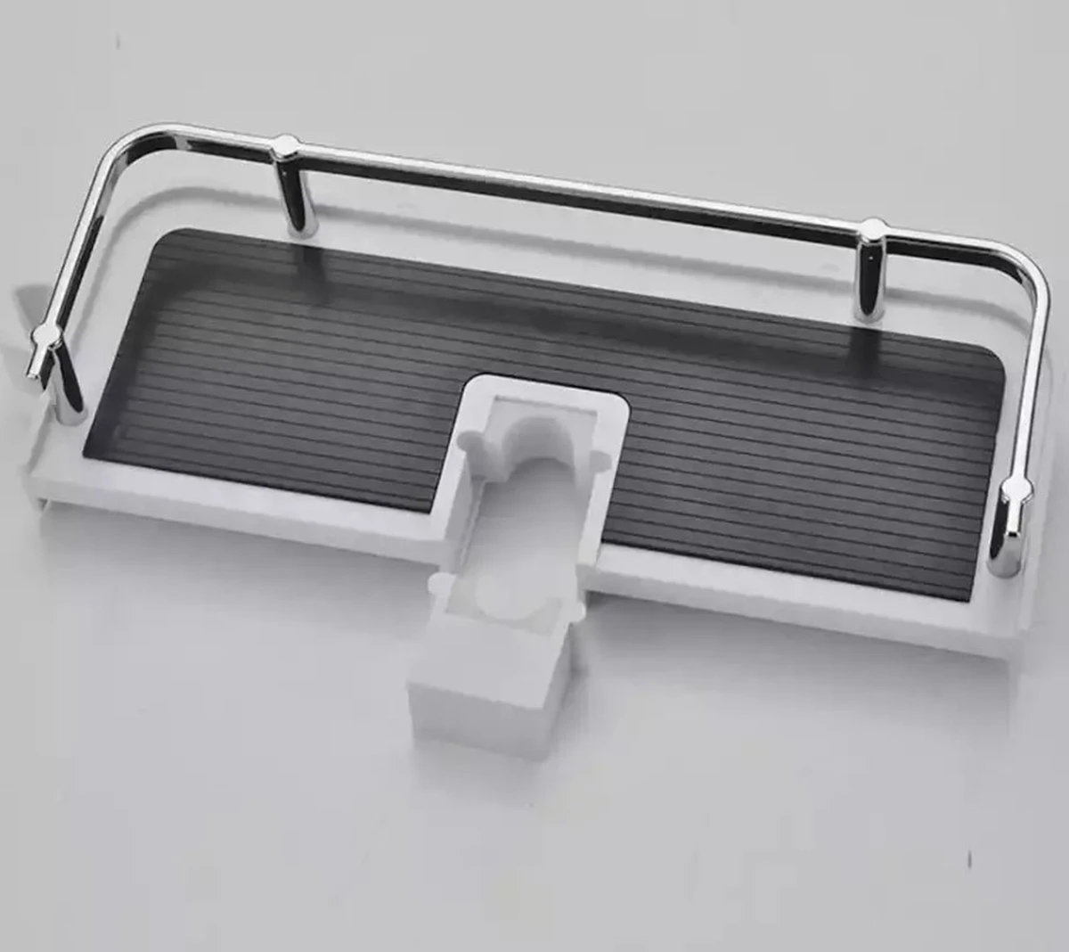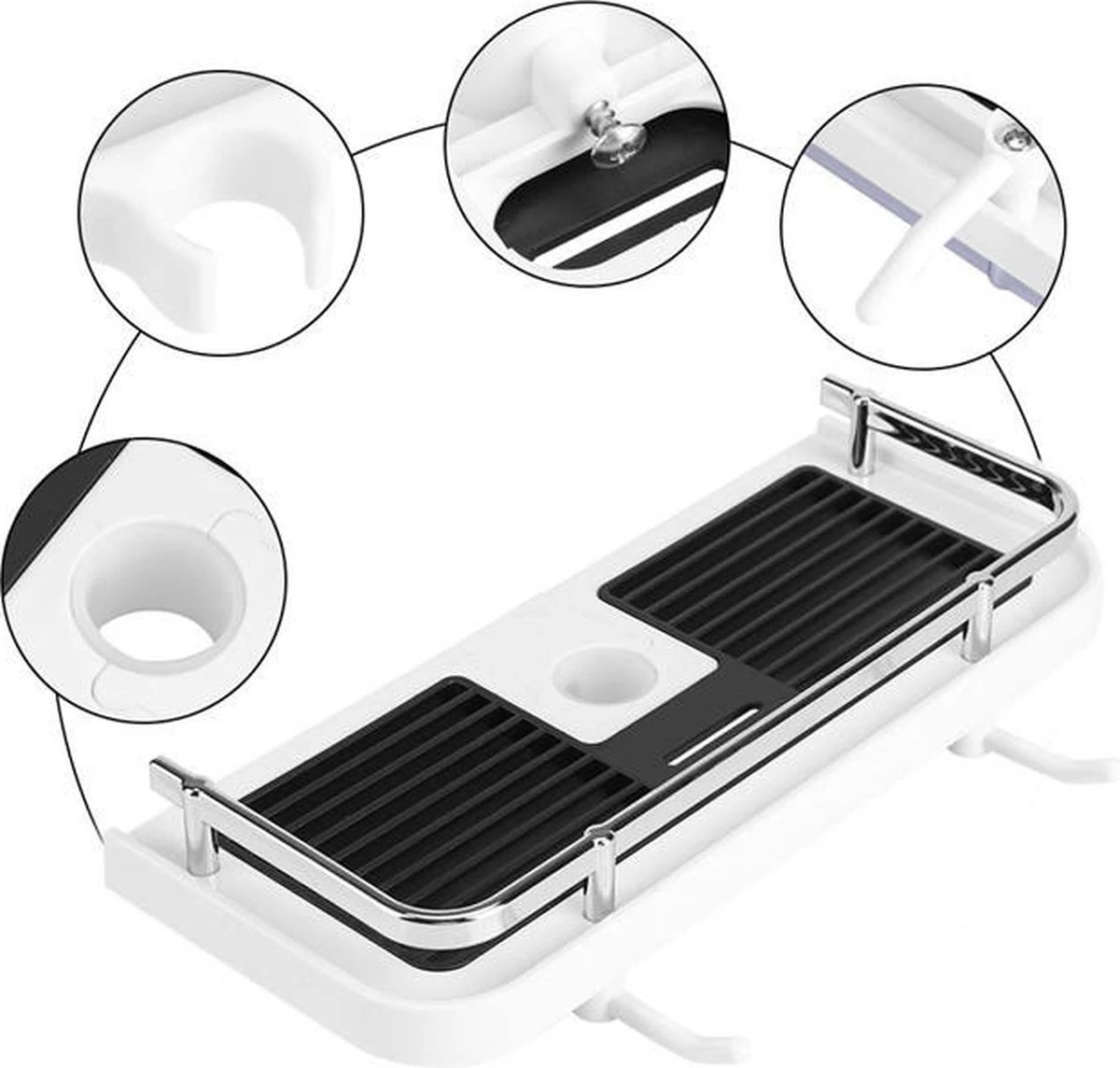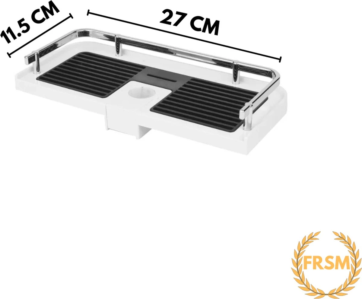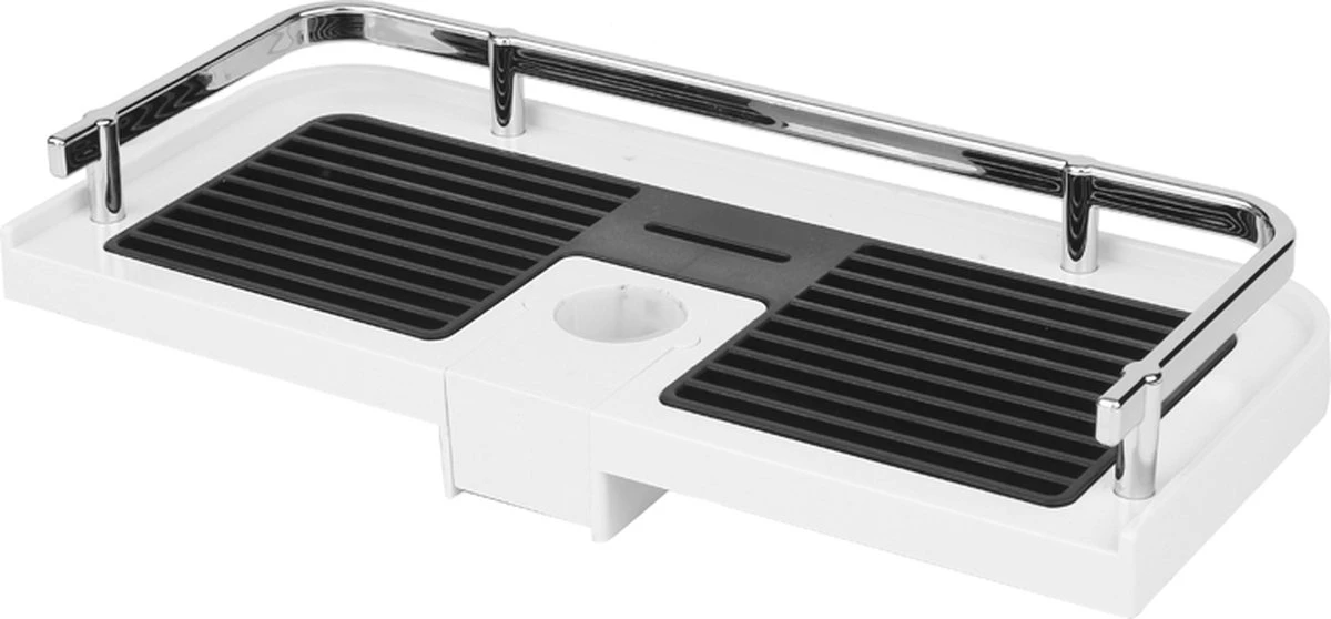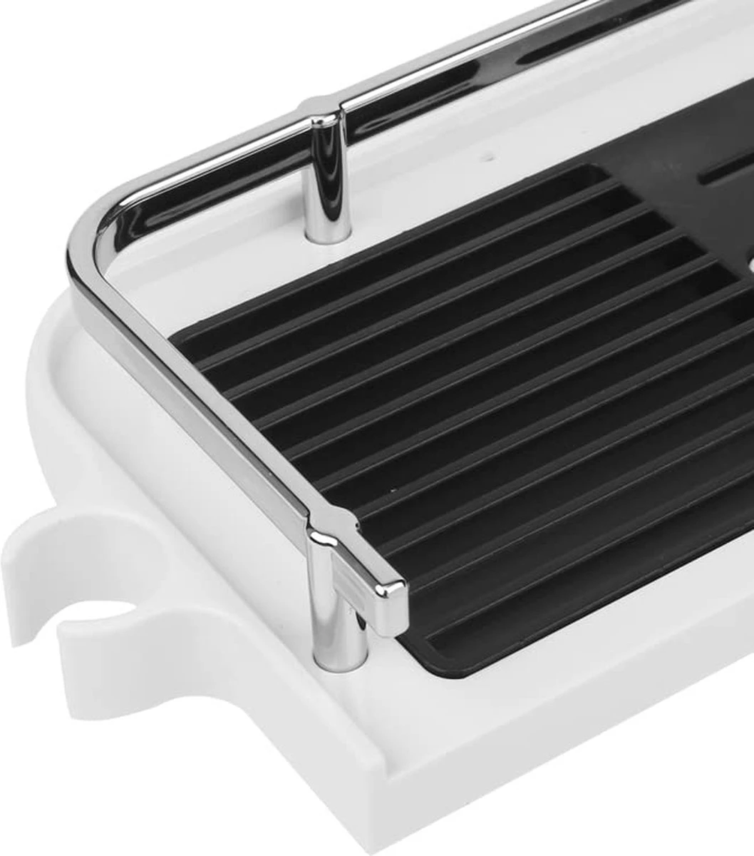 Het doucherek is fijn vormgegeven, voorzien van een zwarte en witte afwerking en gemaakt van stevig plastic met een zilverkleurig hekje. Met een lengte van 27cm heeft het doucherek meer dan voldoende ruimte voor al uw doucheproducten!