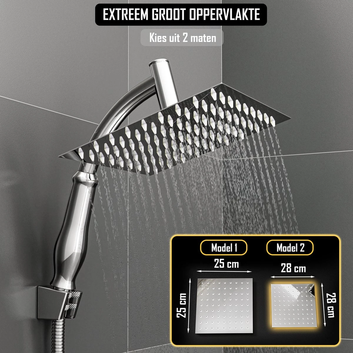 Inhoud pakket: Regendouchekop Deluxe (SS304-Materiaal) | 2 Verlengstukken voor handstuk (ABS-Materiaal)| 1 Bijbehorende doucheslang van 1.5M (SS304-Materiaal) | 1 Douchekop-houder (SS304-Materiaal) | Bijbehorende set schroeven en pluggen | Nederlandse Installatiehandleiding
