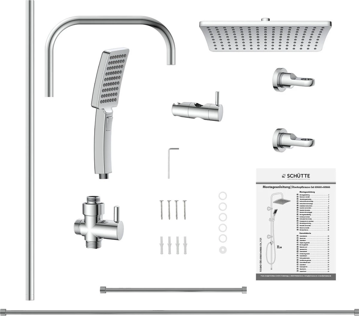 | Verpakkingsinhoud | Hoofddouche, glijstang, handdouche, doucheslang, wandhouders, toebehoren en montage handleiding in diverse talen o.a. Nederlands |