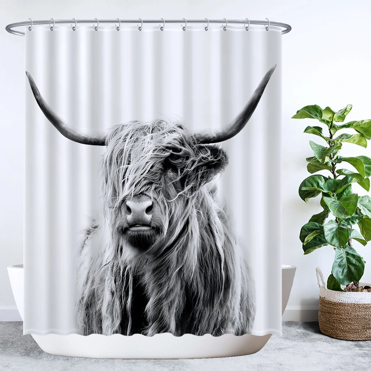Ulticool Douchegordijn – Schotse Hooglander – 180 X 200 Cm – Met 12 Ringen Wit – Semi Transparant – Anti Schimmel – Wit Grijs Zwart
